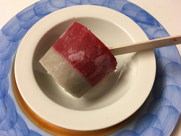 6. Pour the raspberry puree over the frozen banana layer in each cup evenly. Wrap each cup with foil and freeze completely for at least 4 hours.