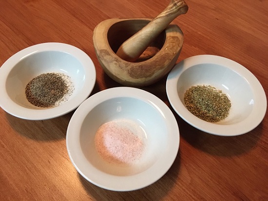 2. Add oregano, salt, and pepper and mix to make a dry paste that does not stick together much.
