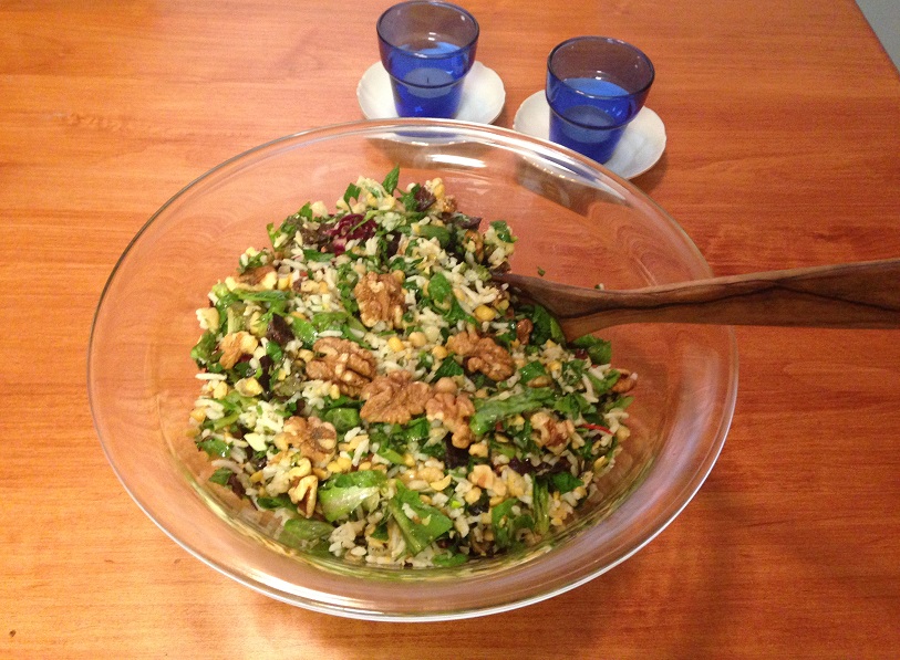 2. Add the rice, chickpeas, asparagus, parsley, romaine, and walnuts to the oil mixture and mix until combined.